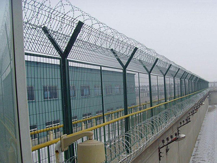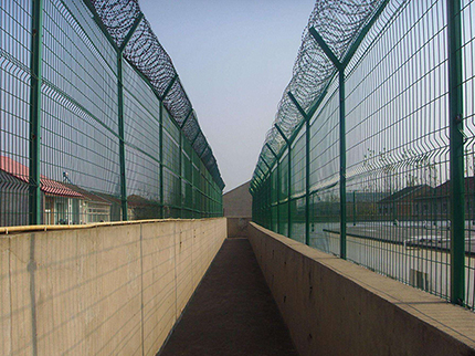 監(jiān)獄圍欄主要是采用高強度的刀片刺網(wǎng)與普通防護網(wǎng)的結(jié)合,由V型支架立拄,加強型焊接片網(wǎng),安全防盜連接件和刀片刺網(wǎng)組成.刀片刺網(wǎng)是一種新型防護網(wǎng),由銳利尖角鍍鋅鋼板或不銹鋼薄板做刀片,鋼絲做芯線組合而成的防護器材。