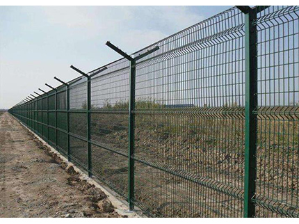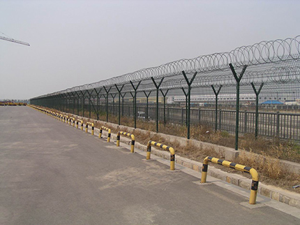飛行區(qū)鋼筋網(wǎng)圍界一般采用5.0mm的優(yōu)質(zhì)低碳鋼絲焊接;網(wǎng)孔(mm) 50x100 50x150 50x200網(wǎng)片中帶有Y型加強(qiáng)筋可增強(qiáng)護(hù)欄網(wǎng)的抗沖擊力。立柱為60X60矩形鋼,頂端含有Y型支架或者采用70mmX100mm的掛式連接立柱,飛行區(qū)鋼筋網(wǎng)圍界網(wǎng)片鏈接采用特制SBS扣件,有效防止人為破壞性拆卸,產(chǎn)品均為熱鍍鋅后采用高質(zhì)量的聚酯粉末靜電噴涂,采用國(guó)際流行的RAL顏色,飛行區(qū)鋼筋網(wǎng)圍界主要用途:機(jī)場(chǎng)封閉 、私人地域、軍事重地、 場(chǎng)區(qū)圍網(wǎng)、 開(kāi)發(fā)區(qū)隔離網(wǎng)使用;
